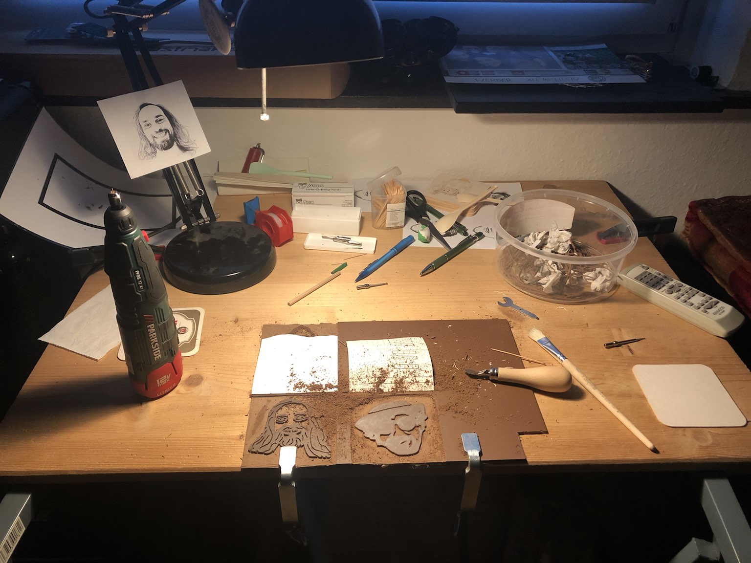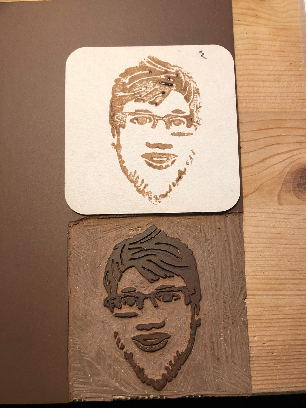Um in der gesamten Zeit der musikalischen Abstinenz die Fratzen seines Musikantenstadls nicht zu vergessen, hat Erik sich ans Werk gemacht und begonnen Linolschnitte der Band anzufertigen. Dabei haben diese nicht nur das Ziel einer Gedächtnisstütze, sondern die Drucke sollen auch von praktischem Nutzen sein. Die Vorlagen eignen sich perfekt, um die Rückseite von Paulines Bierdeckeln zu bedrucken. Unsere Bierdeckel machen jetzt nicht nur Eindruck, sondern auch Zweidruck ;). Mal sehen, ob ihr die fertigen Gesichter erkennt. Weitere Druckvorlagen sind derzeit in Arbeit. Die Vorlagen können in ferner Zukunft auch dafür genutzt werden, um deinen persönlichen TLB-Fanartikel zu schmücken. Welche Fanartikel das werden sollen, steht noch nicht fest. Wir freuen uns über eure Vorschläge in den Kommentaren.