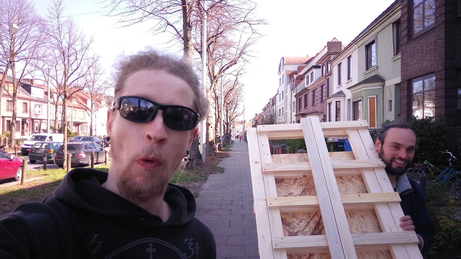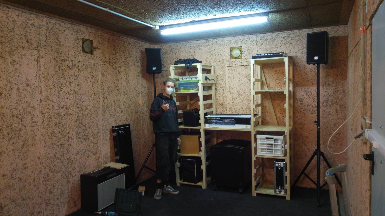 Trotz der letzten Monate und der Distanz-„Proben“ haben wir natürlich nicht untätig rumgesessen. Vielmehr haben wir in voller Vorfreude auf die gemeinsamen Proben in hoffentlich baldiger Zukunft die Gestaltung unseres neuen Proberaums vorangetrieben. Kristian und Erik haben für unsere Proberaumfreunde „The Educators“ ein Regal gebaut. Dieses bietet kombiniert mit unserem bisherigen Aufbewahrungsregal sowohl Stauraum für allen möglichen Kram als auch Platz für die Anlage und einen Kasten Bier. Danach machten sich die Ton- und Elektronik-“Experten“ Erik und Kim daran den Kabelsalat großzügig im Proberaum zu verteilen und geeignete Steckverbindungen zu suchen. Als Salatdressing gab es im Anschluss eine Hopfenkaltschale. Seht selbst:
